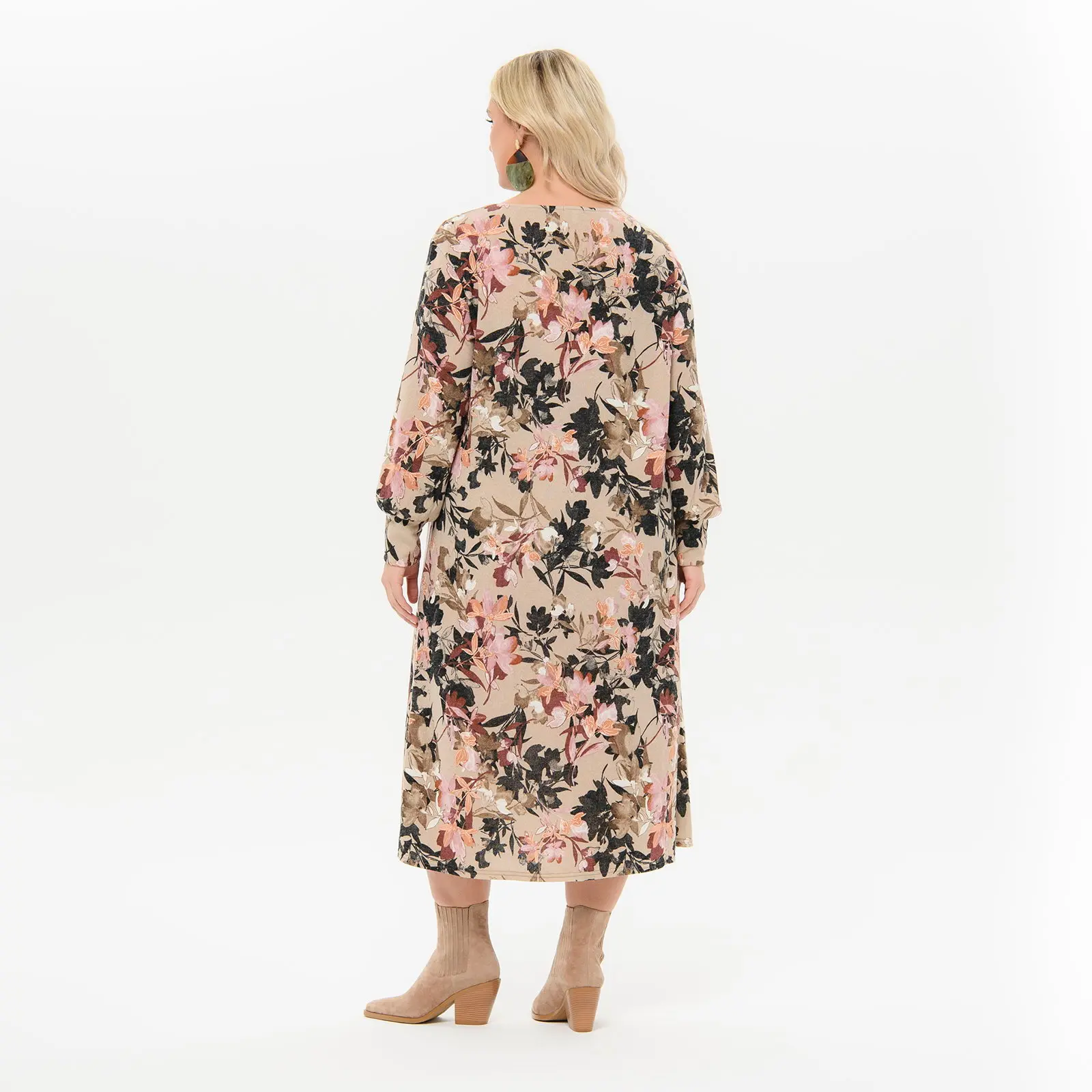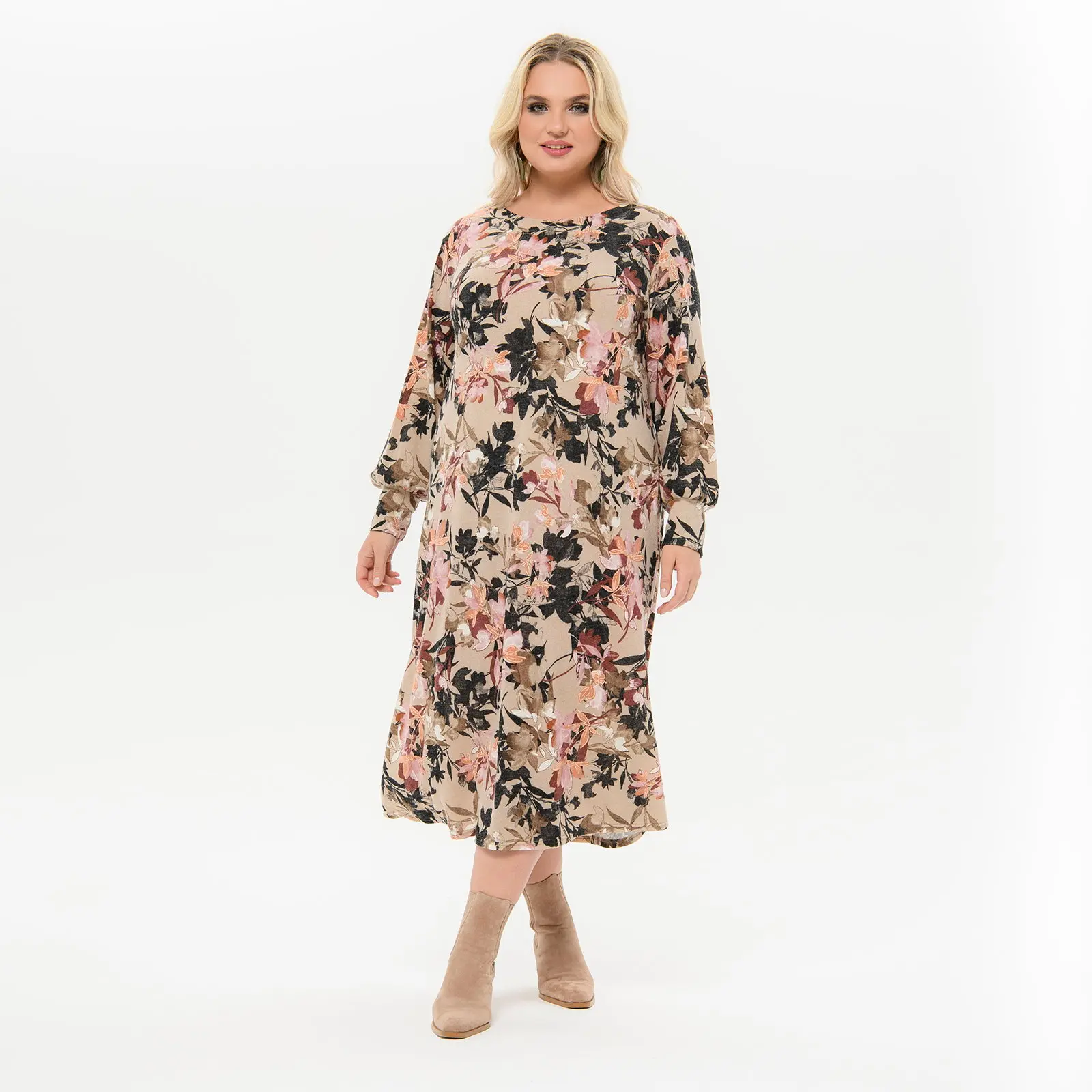 > Платье миди А - силуэта, джерси - ангора бежевая, принт цветочный