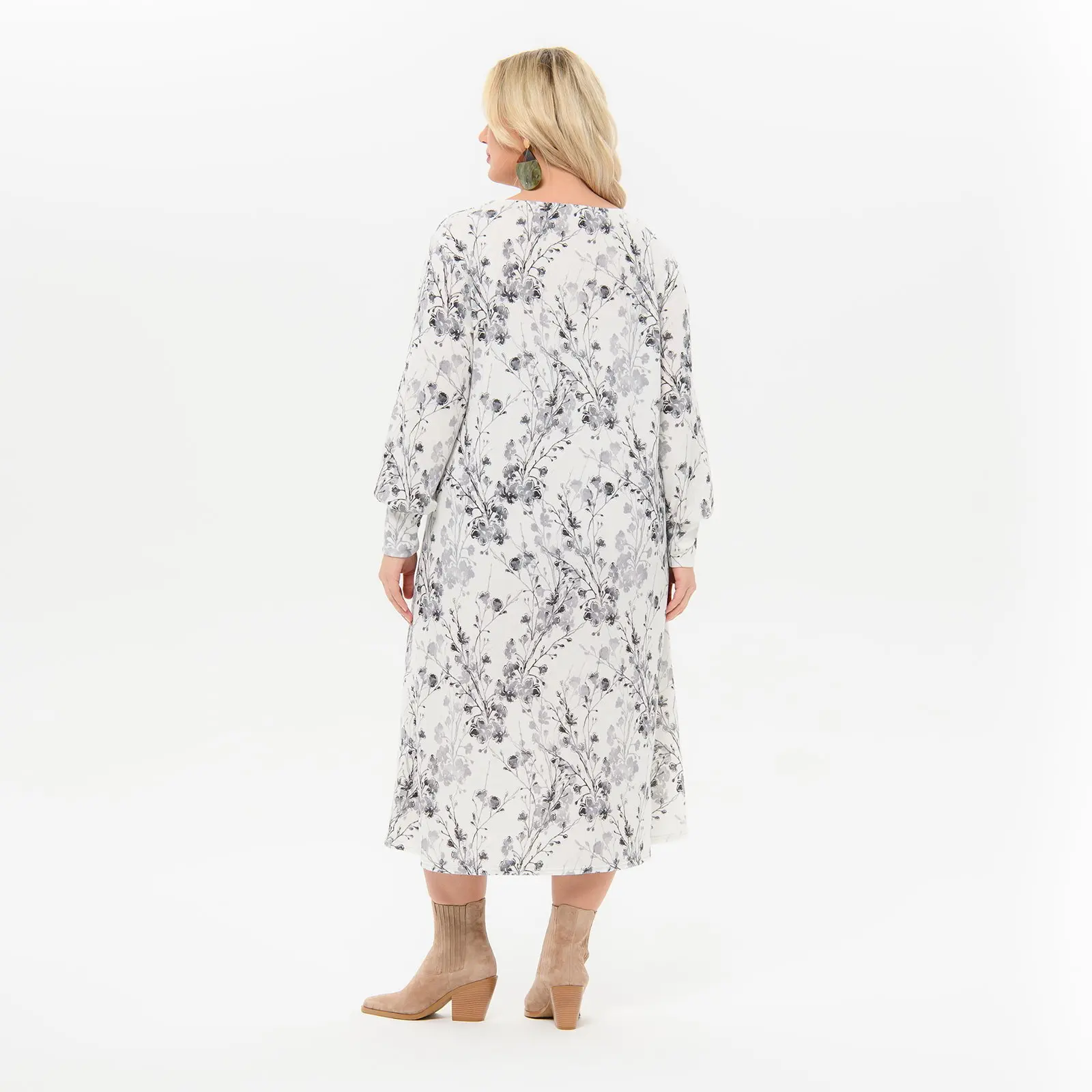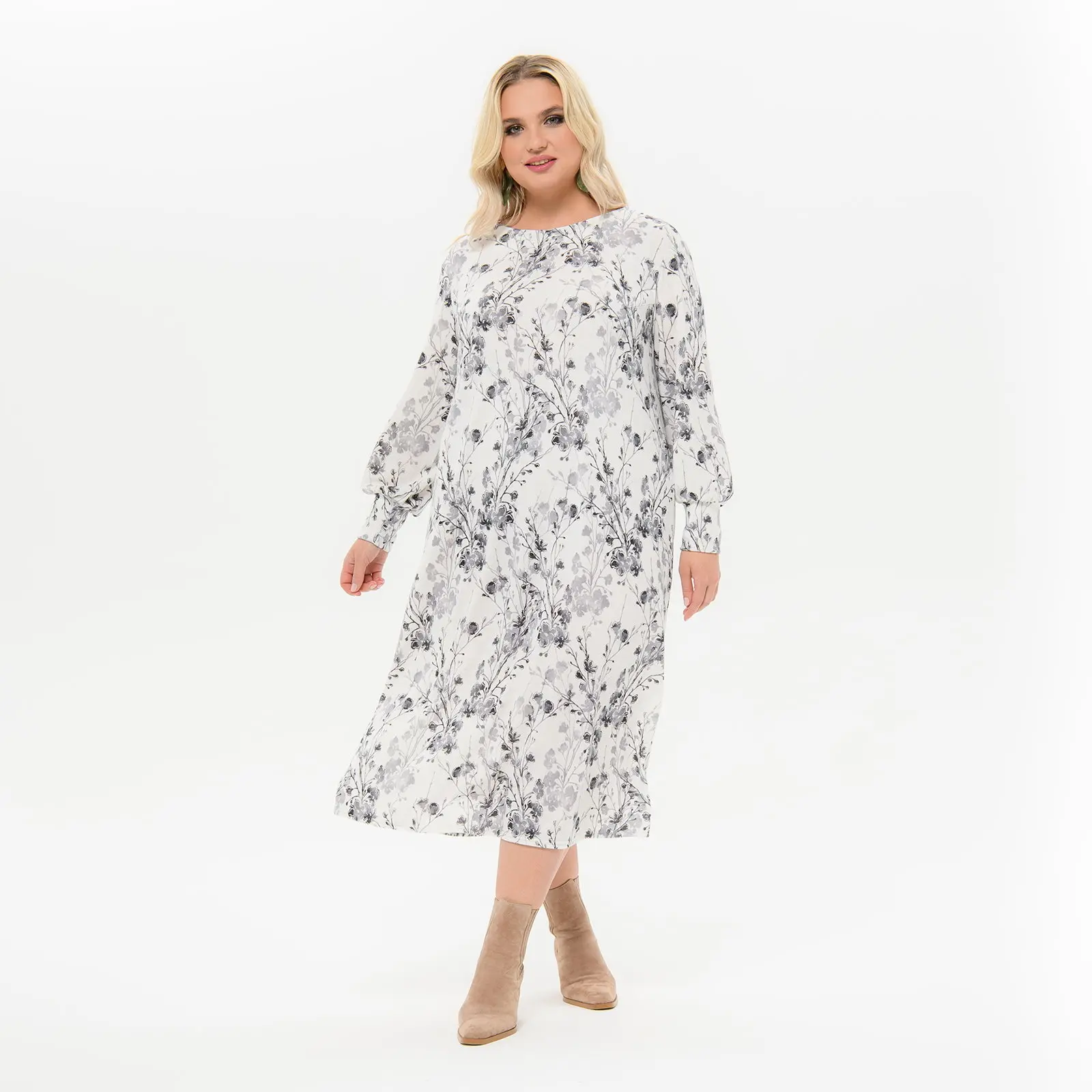 Платье миди А - силуэта, джерси - ангора нежно-серая, принт цветочный