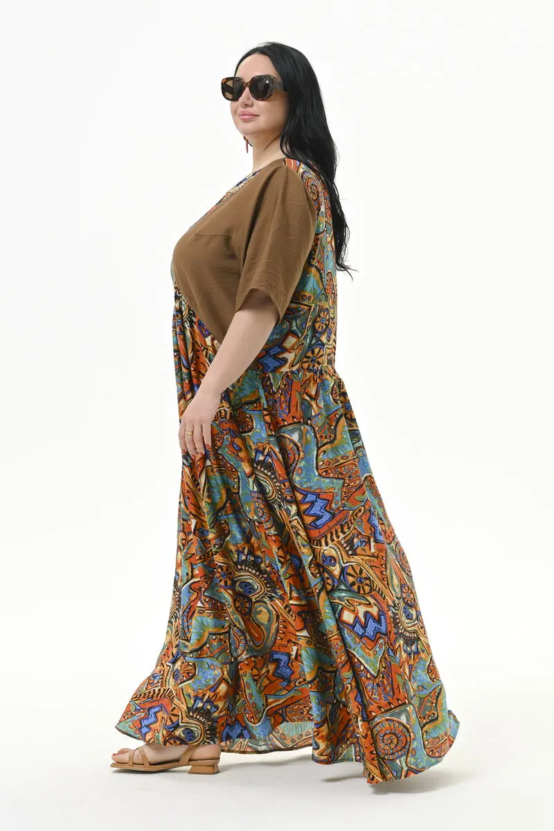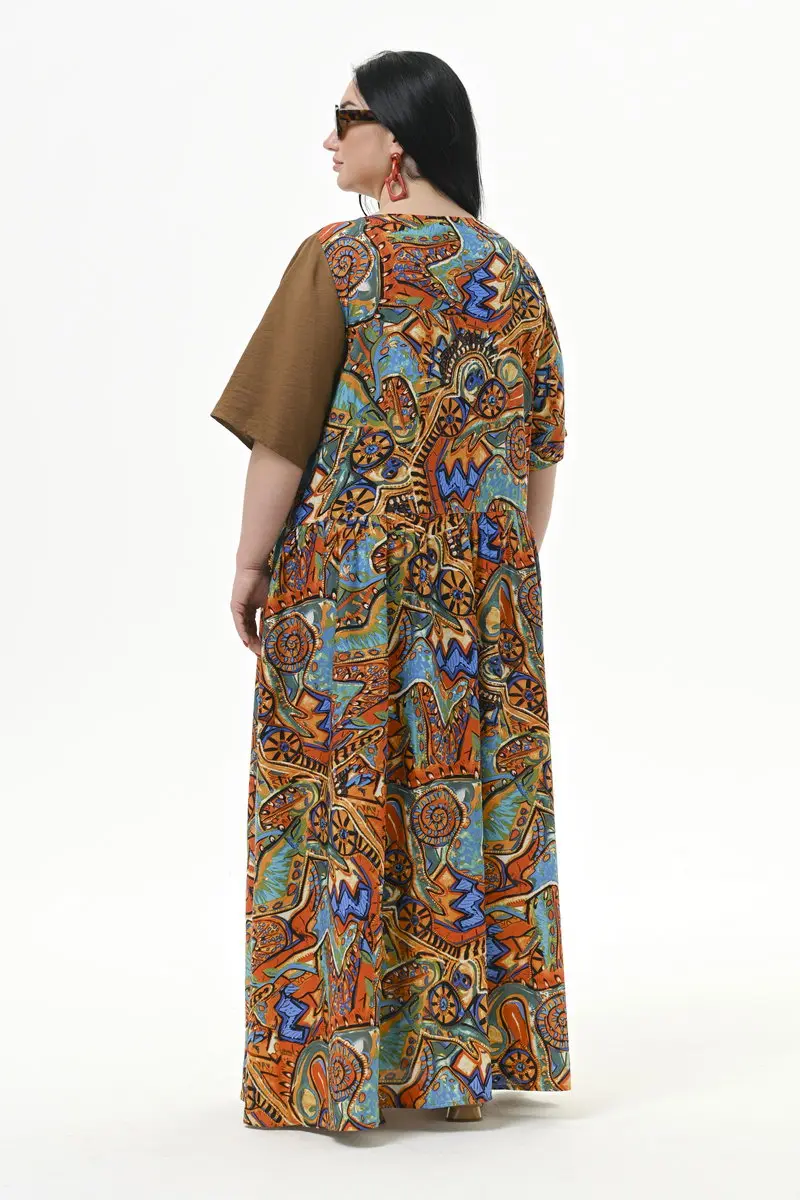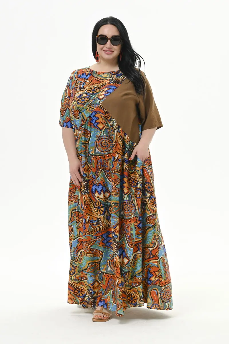 Платье комбинированное из вискозы, принт "яркая абстракция", отделка "корица"