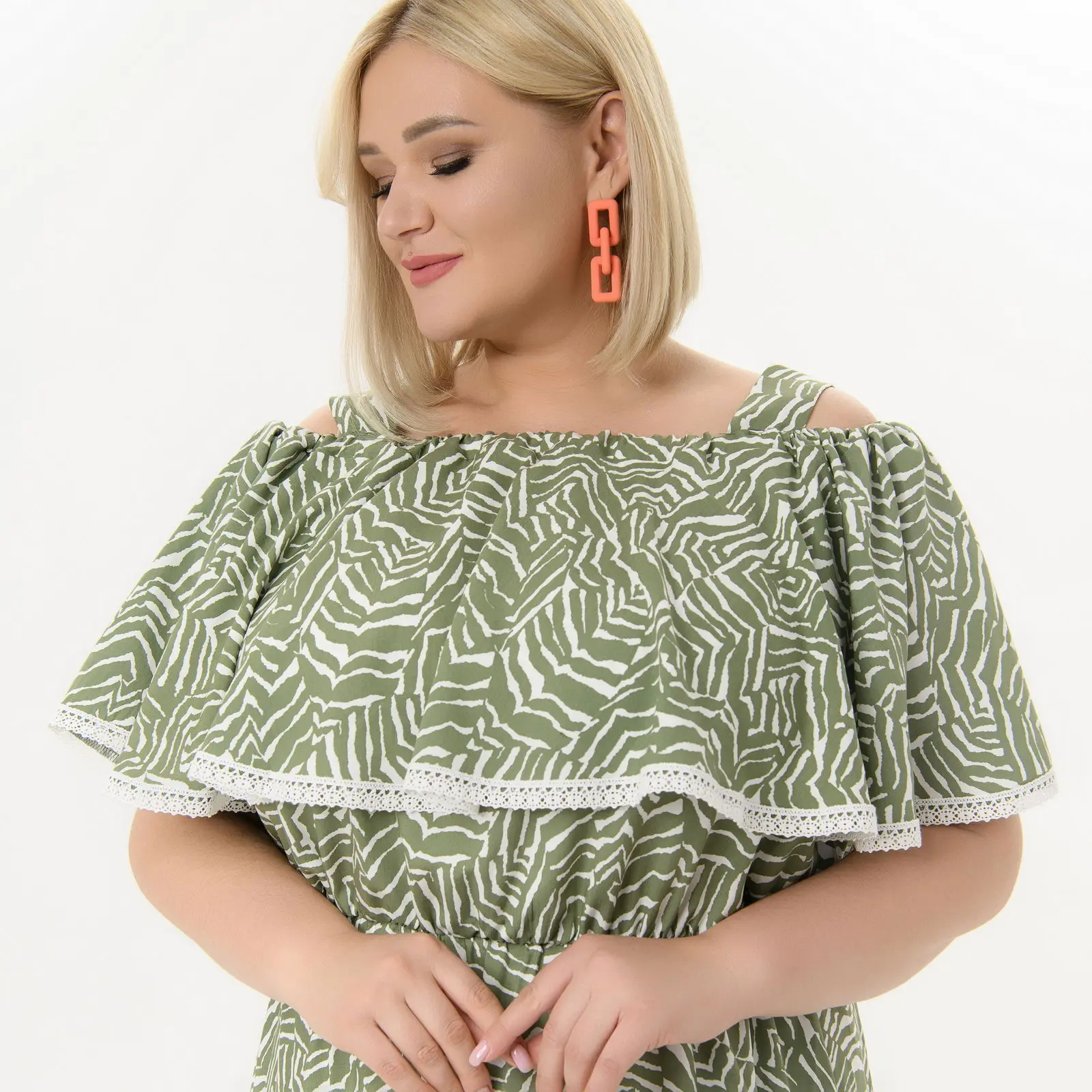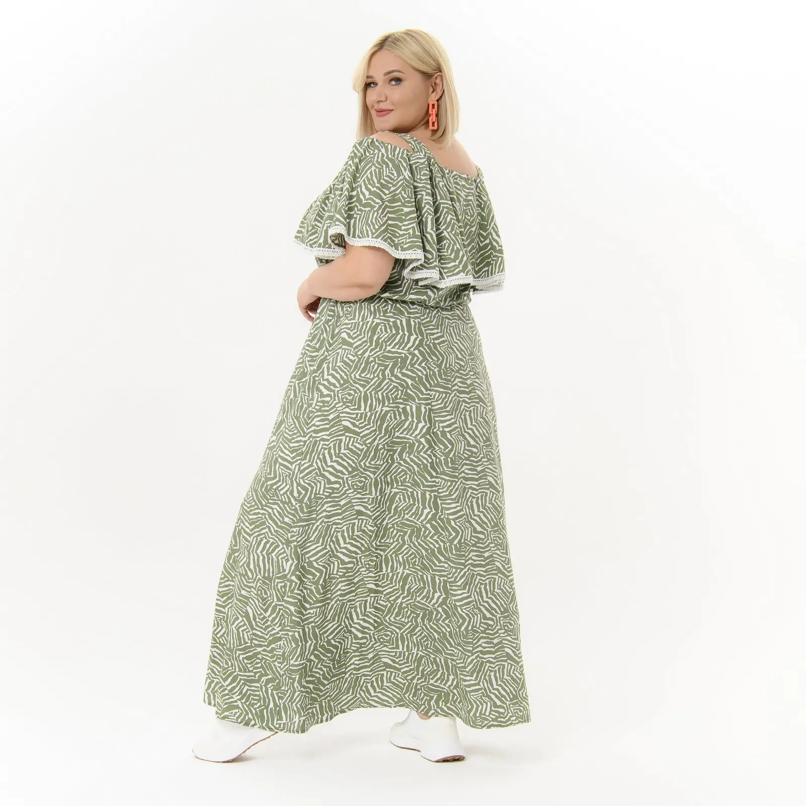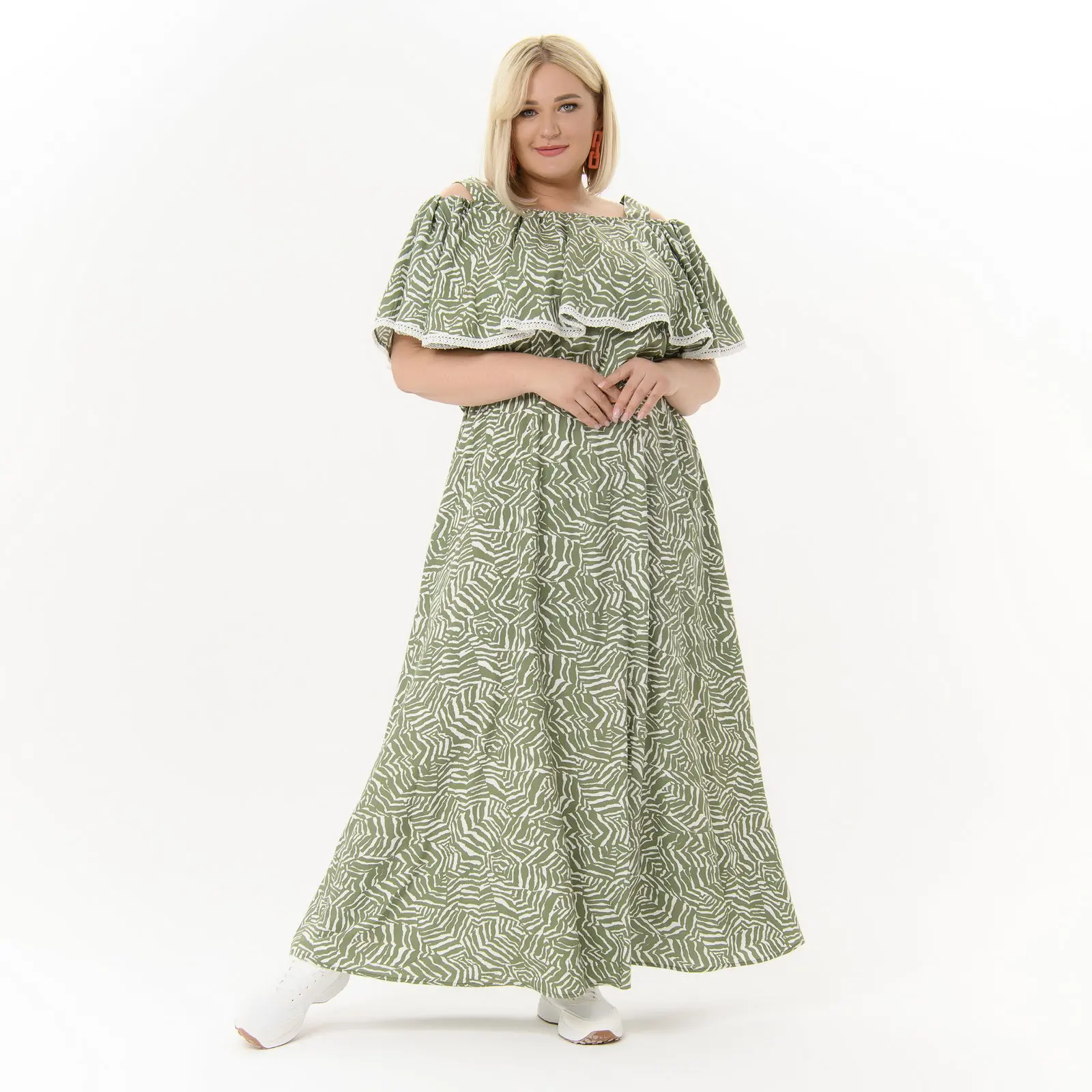Платье из штапеля с воланом по горловине, принт "оливковые листья"