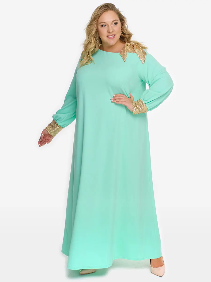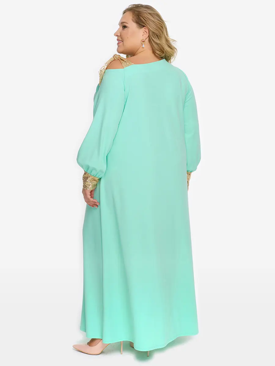 Вечернее платье свободного силуэта с длинными рукавами. Низ рукава со сборкой, на манжете из пайеток. Открытое плечо украшает бретель из пайеток.