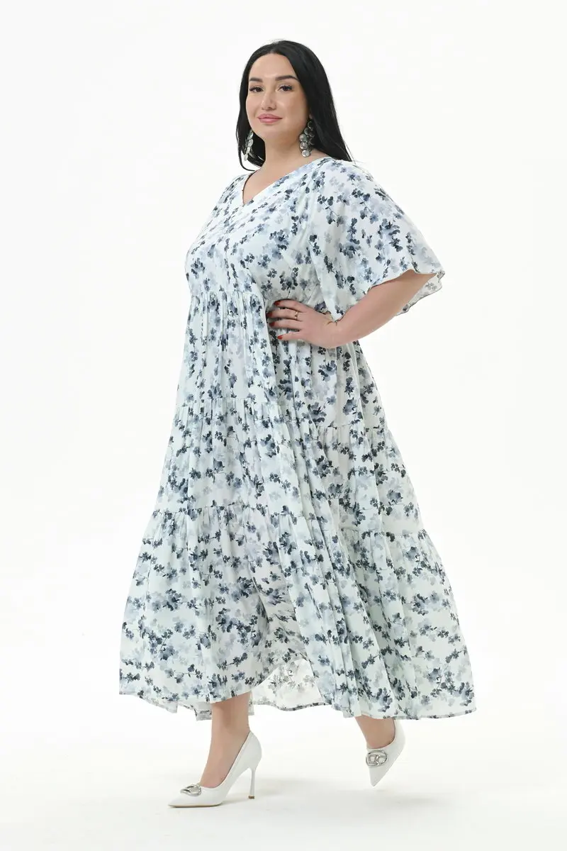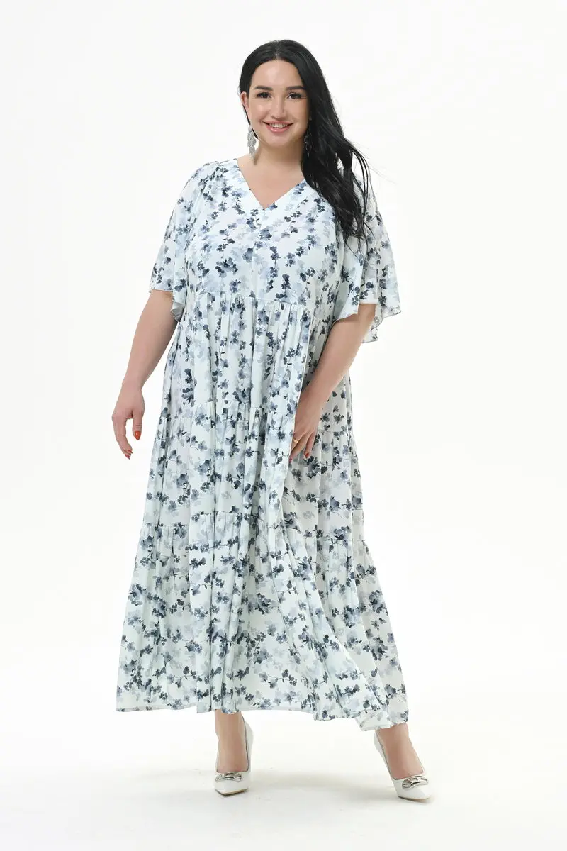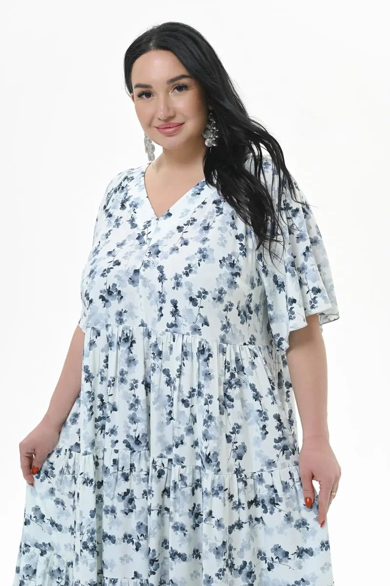 Платье каскадное, с V-вырезом, штапель, принт "цветочная дымка"