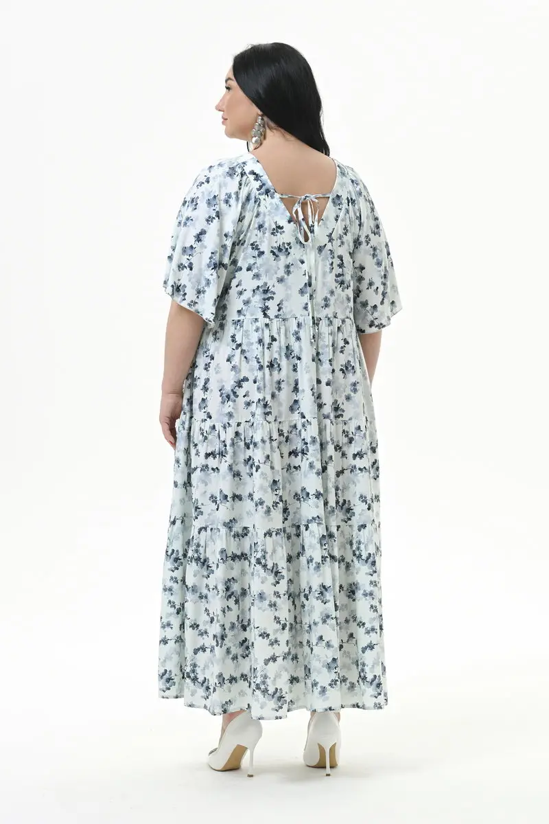 > Платье каскадное, с V-вырезом, штапель, принт "цветочная дымка"