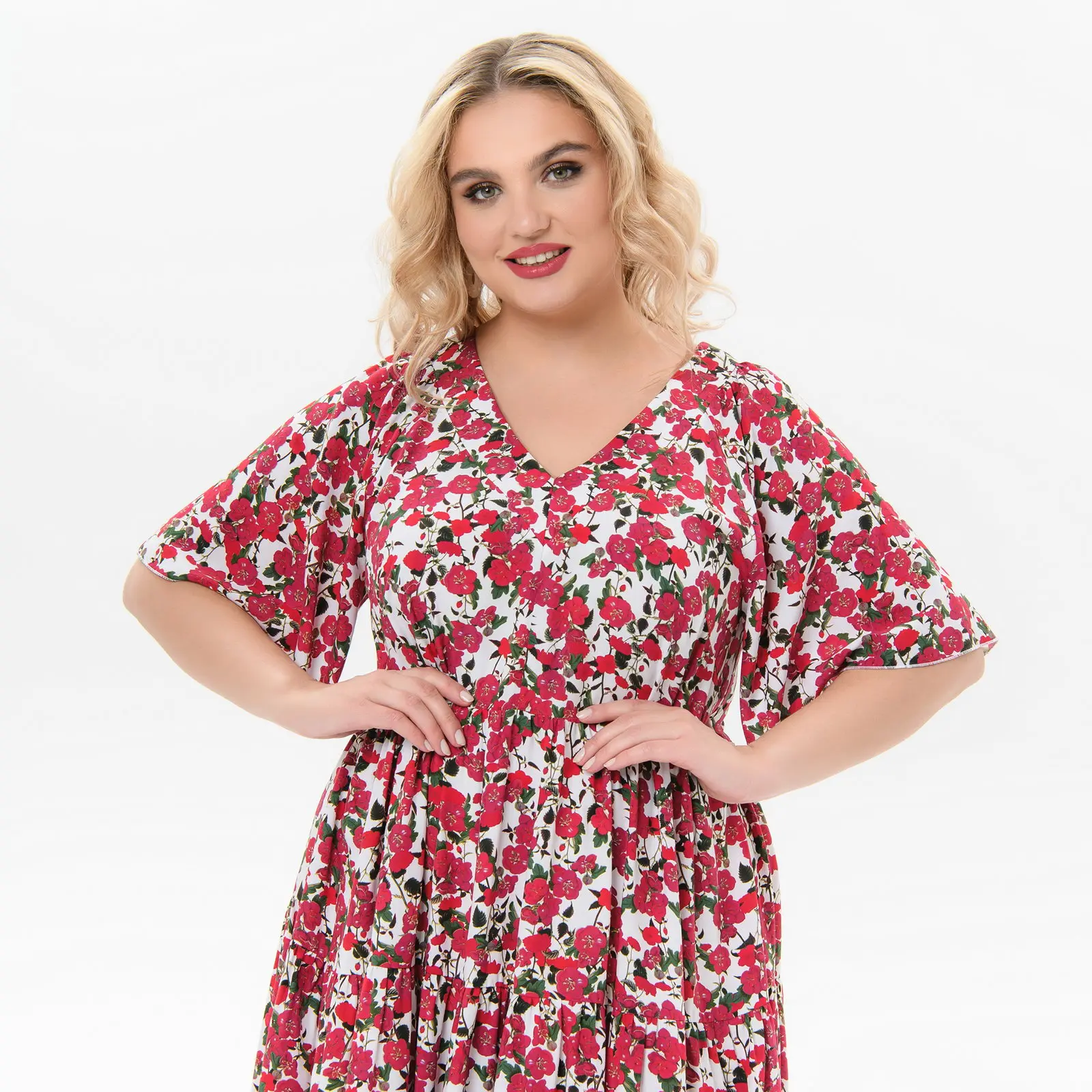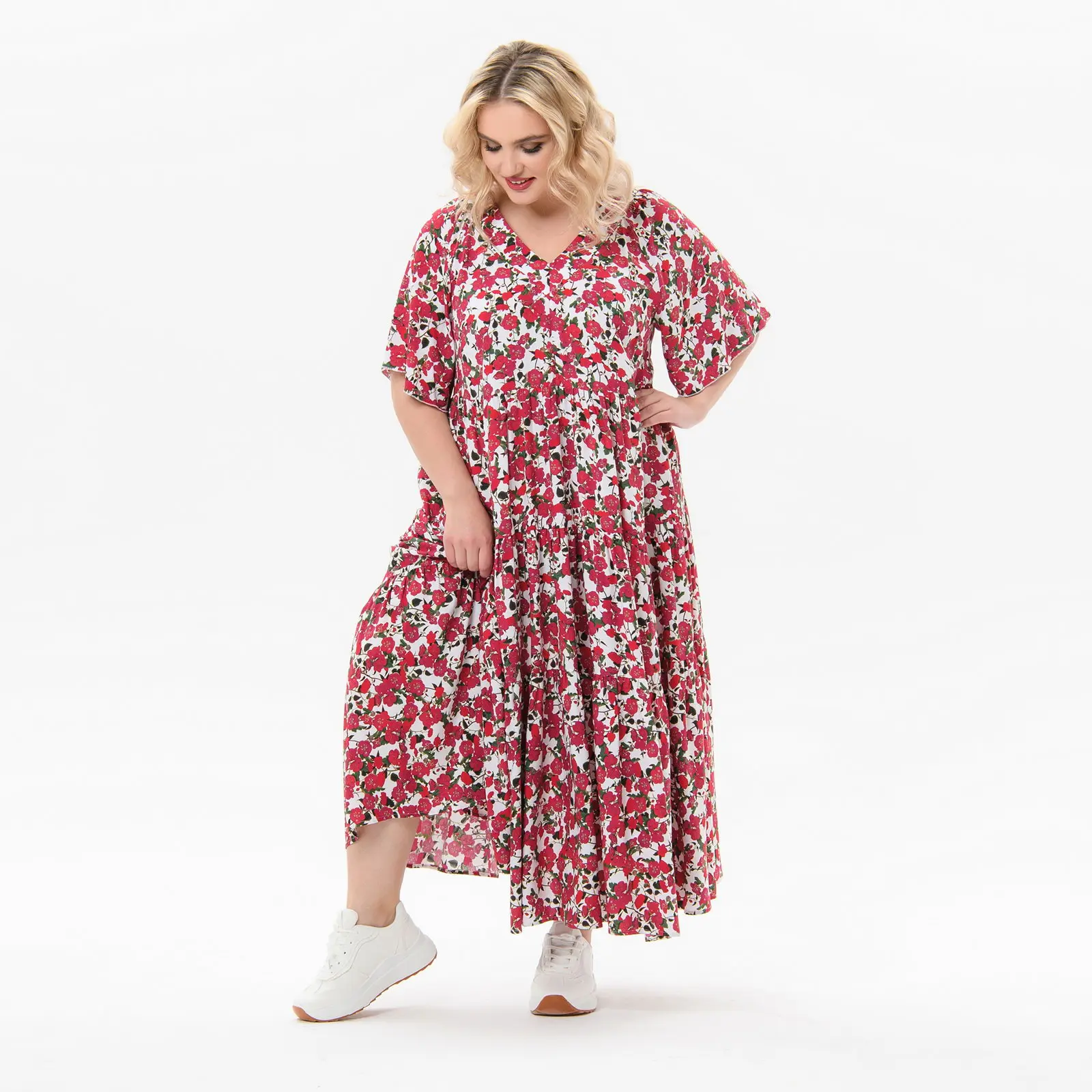 Платье каскадное, с V-вырезом, штапель, принт "розовый сад"