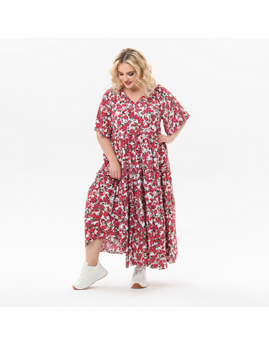 > Платье каскадное, с V-вырезом, штапель, принт "розовый сад"