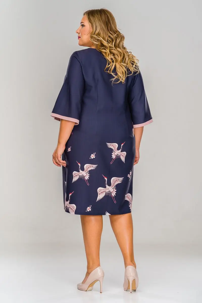 Платье полуприлегающего силуэта из крепа с эластаном. Принт журавли. Рукав расширенный, по низу рукава отделка цвета сомон шириной 2 см.