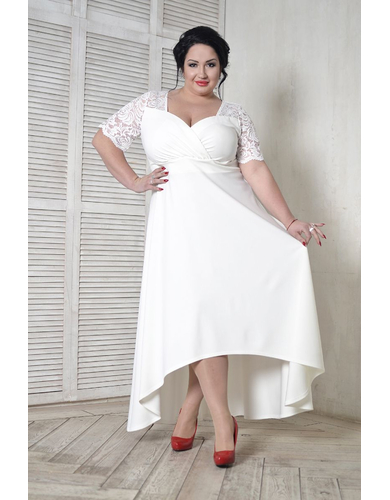 Эффектное вечернее платье прилегающего силуэта, расклешенное к низу. Асимметричная линия низа и кружевная кокетка. Элегантность этой модели придает утонченное сочетание отделки кружевом и безупречность кроя. Прекрасный вариант для свадебного торжества.