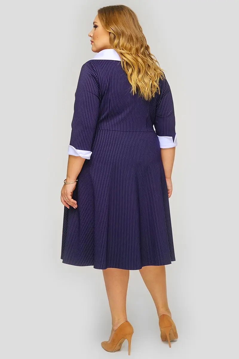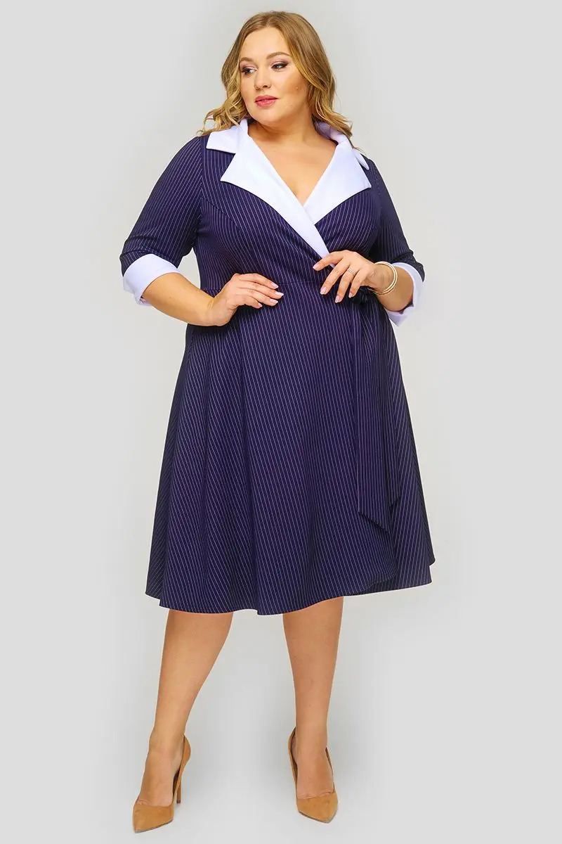 Платье отрезное по линии талии с запАхом, завязывается на пояс. Внутренний борт фиксируется резинкой. Воротник и манжеты-отвороты белого цвета. Ткань - джерси, состав: 65%вискоза, 25% полиэстер, 10% эластан. Цвет - темно-синий в полоску * длина изделия по спинке от 107 см длина юбки от 70 см (линия талии слегка завышена)