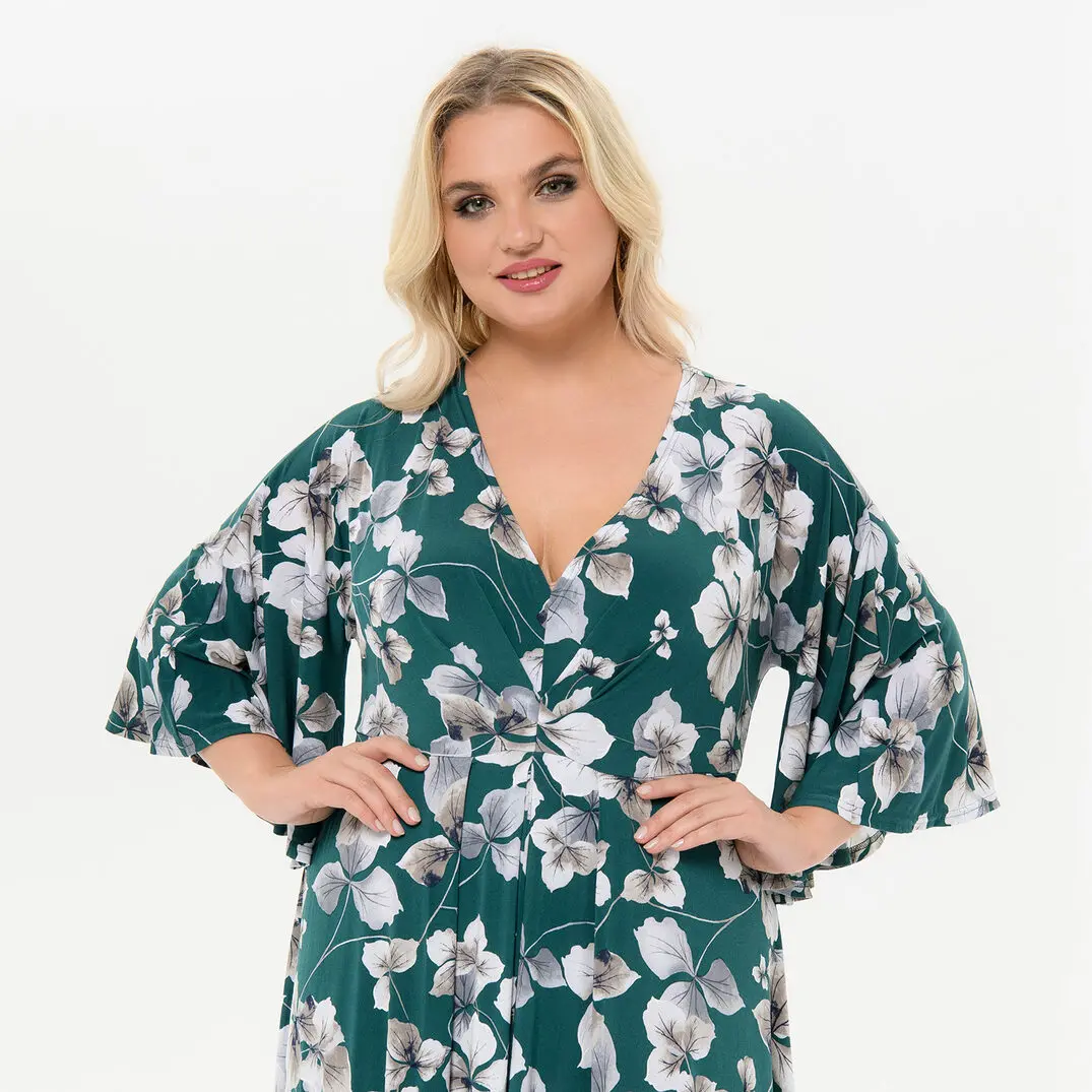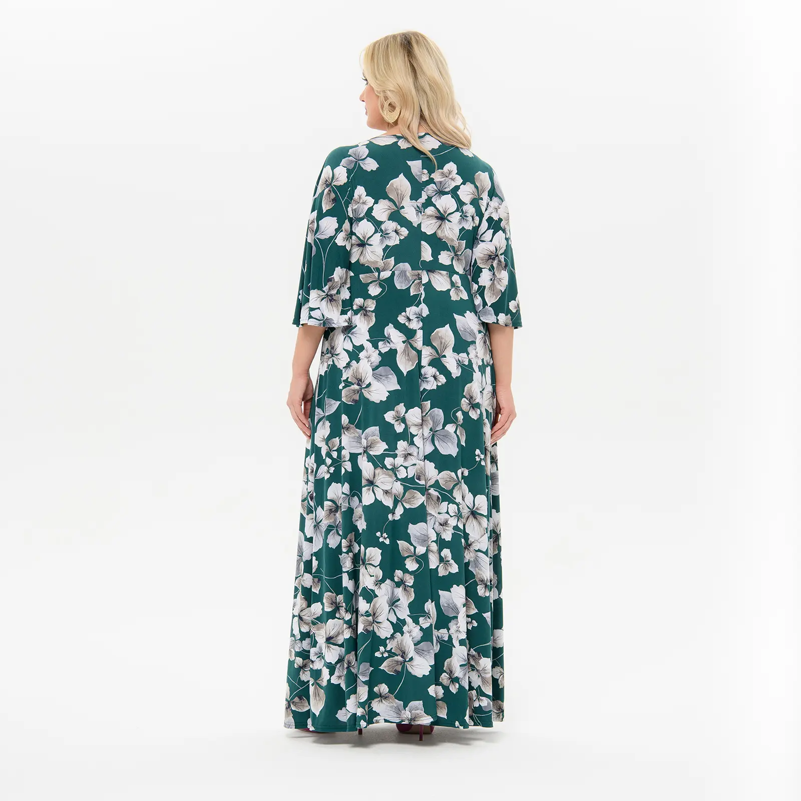 Платье длинное, с разрезом спереди, изумрудное, принт цветочный