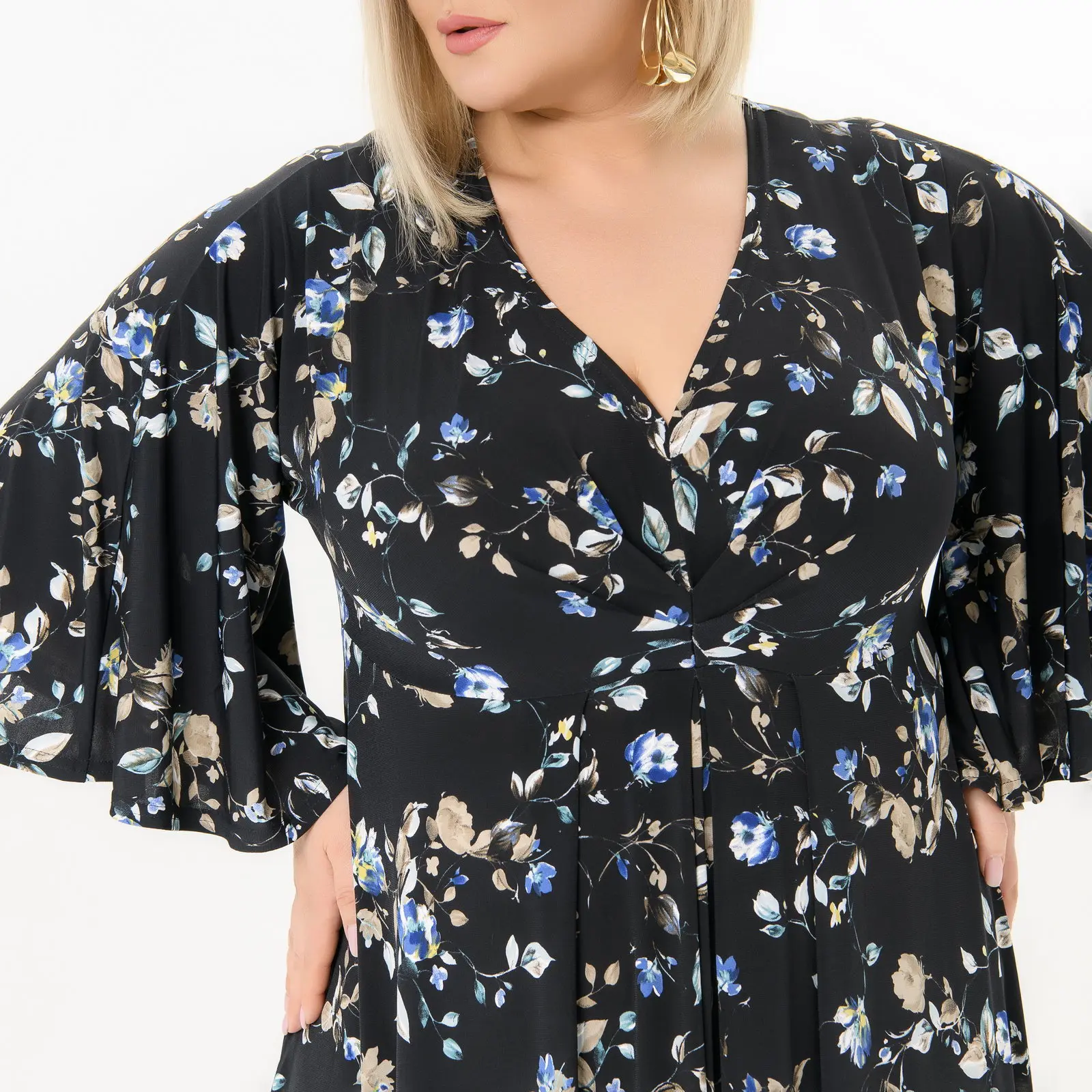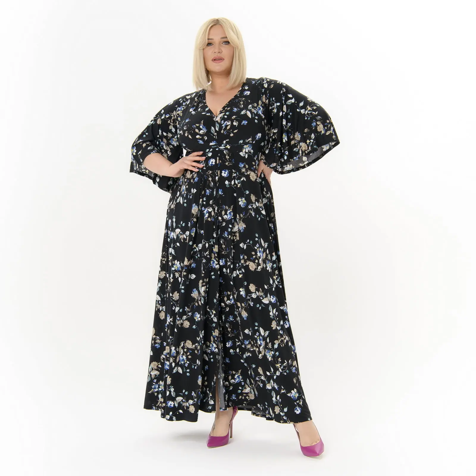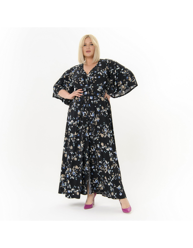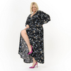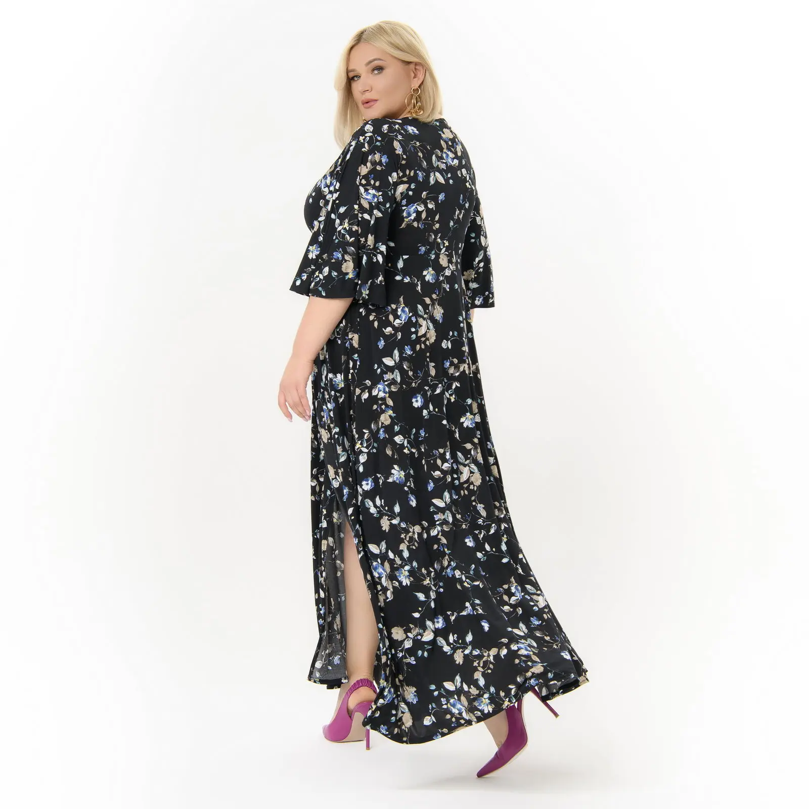 > Платье длинное, с разрезом спереди, черное с бирюзовыми цветами