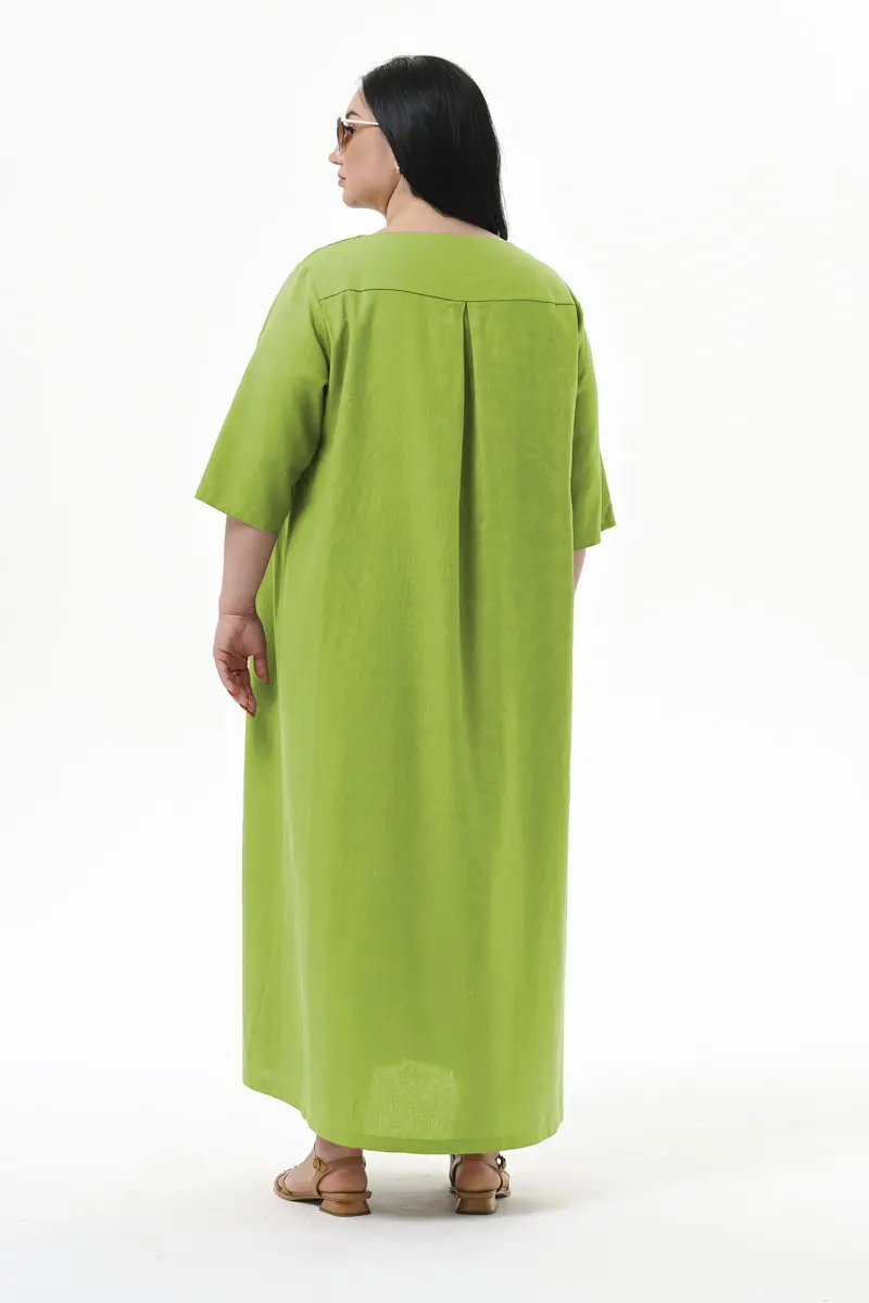 Платье удлиненное А-силуэта из смесовой ткани, содержащей в составе лен и вискозу.