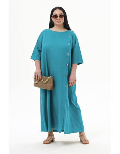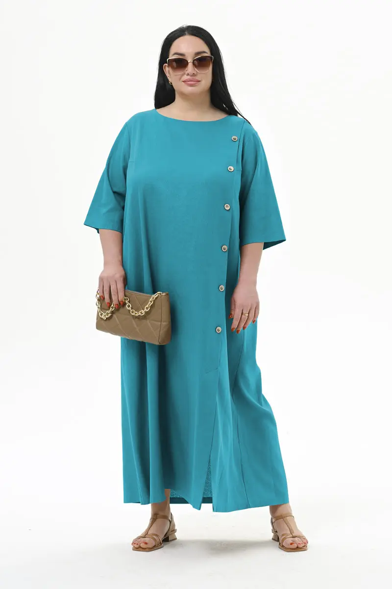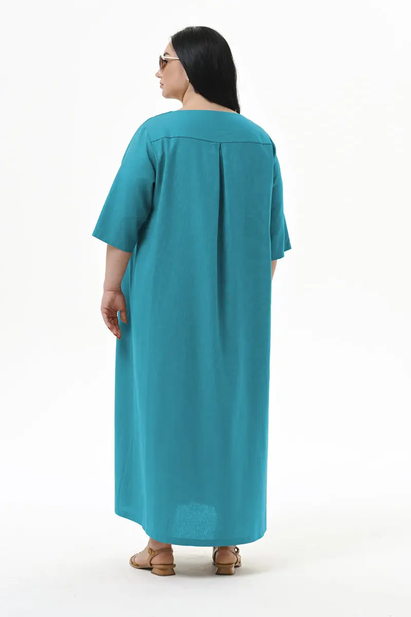 Платье удлиненное А-силуэта из смесовой ткани, содержащей в составе лен и вискозу.