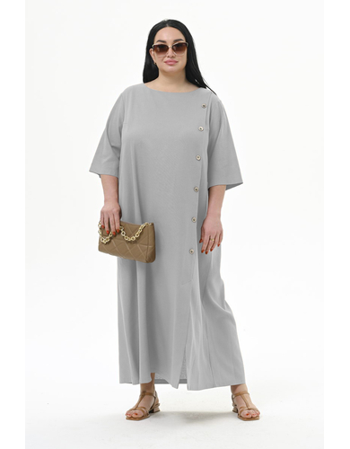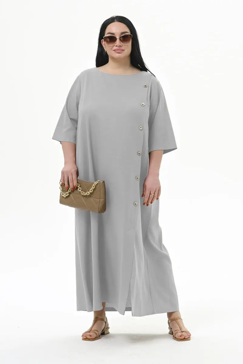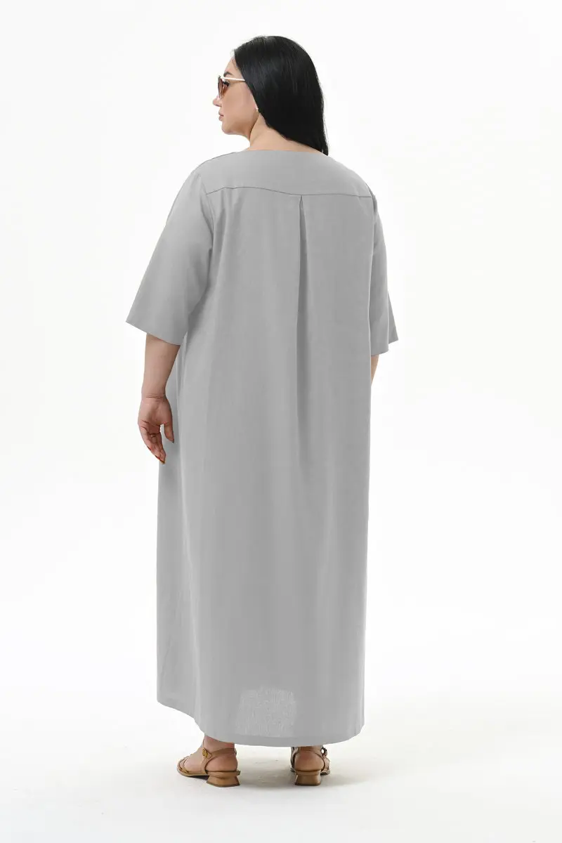 Платье удлиненное А-силуэта из смесовой ткани, содержащей в составе лен и вискозу.