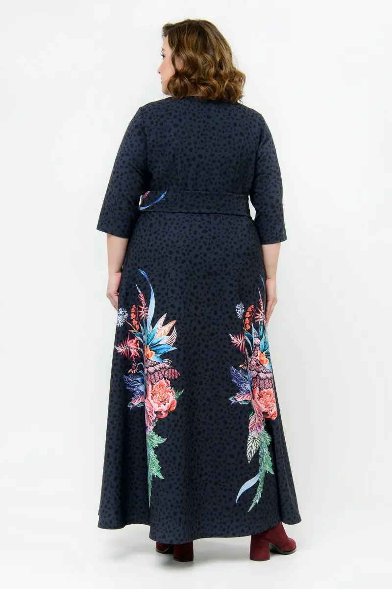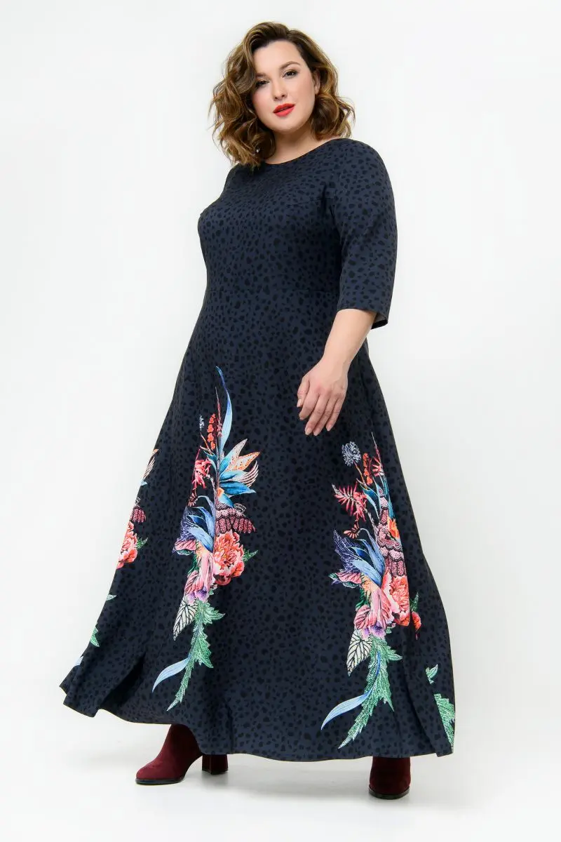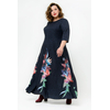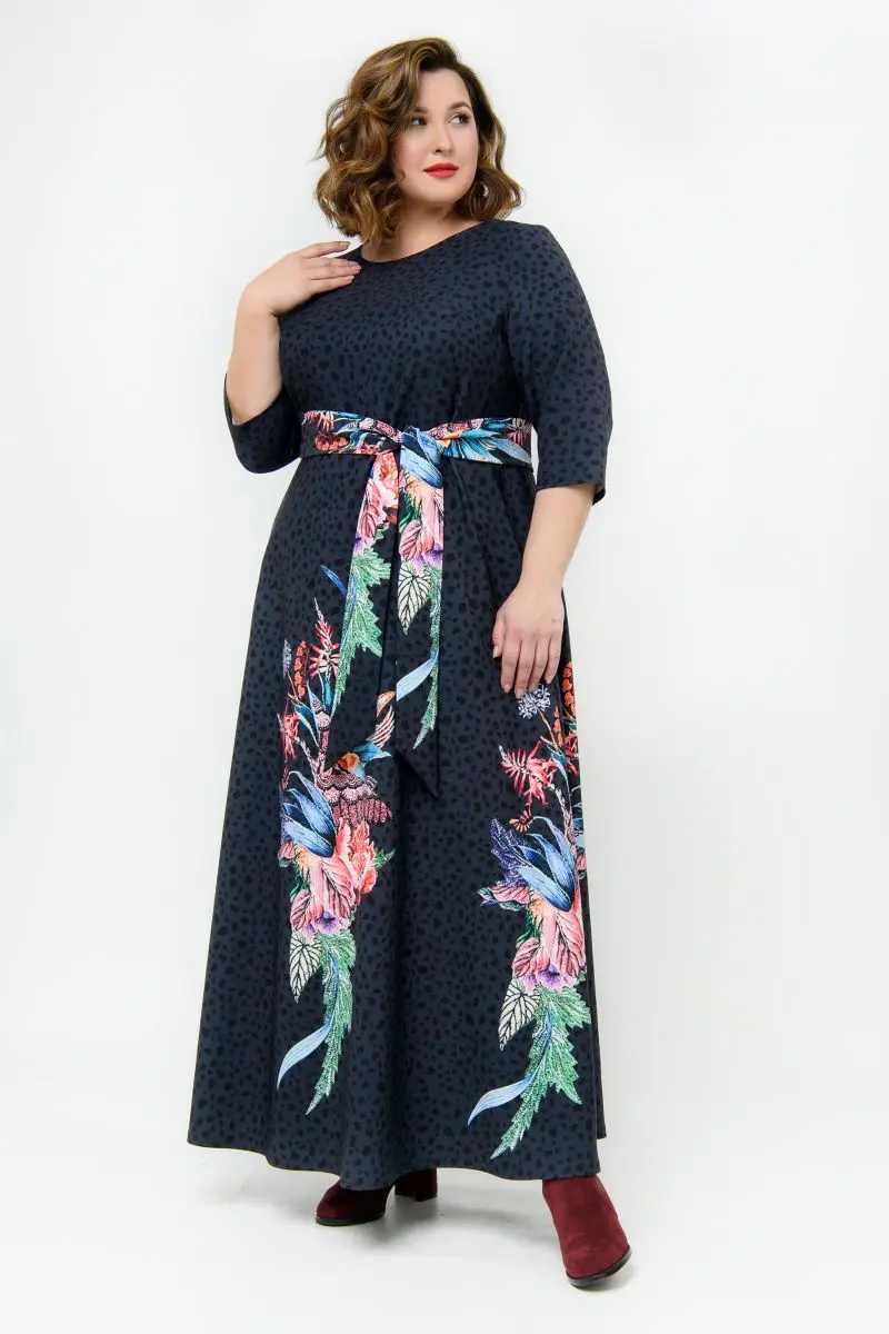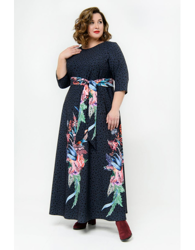 Романтичное длинное платье из крепа с эластаном. Принт яркий. Отрезное по линии талии, юбка расклешенная.
