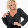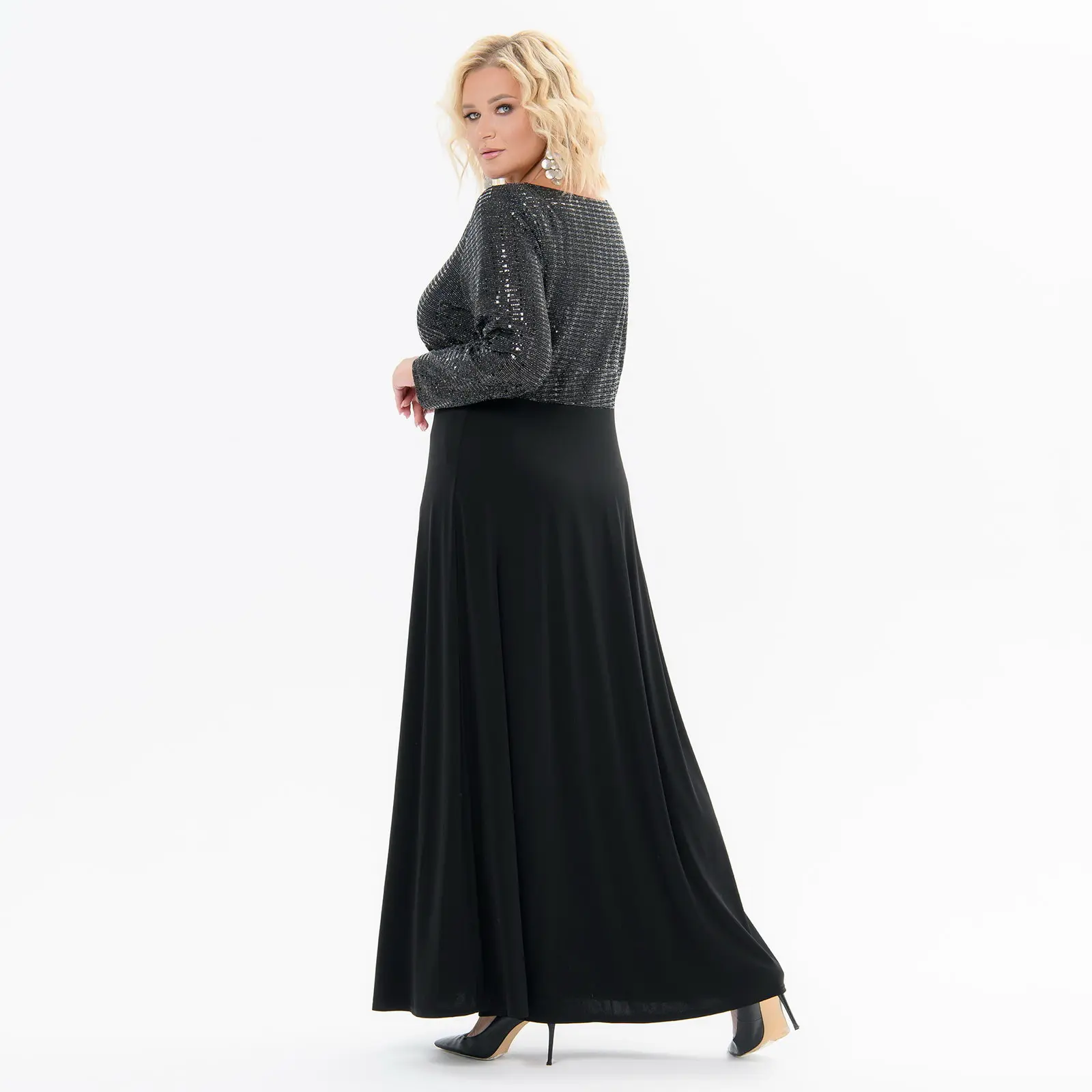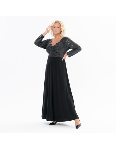 Элегантность этой модели придает утонченное сочетание струящейся юбки с мерцающим блеском ткани верхней части.