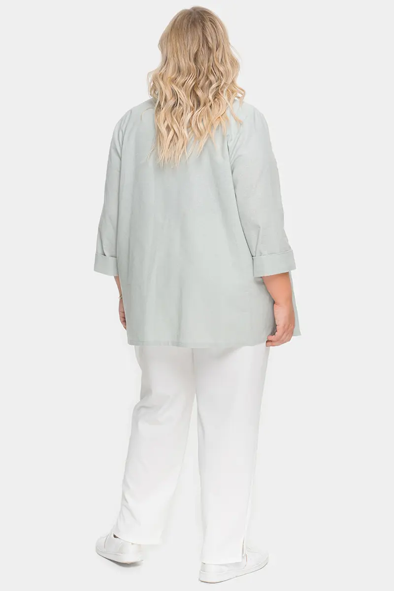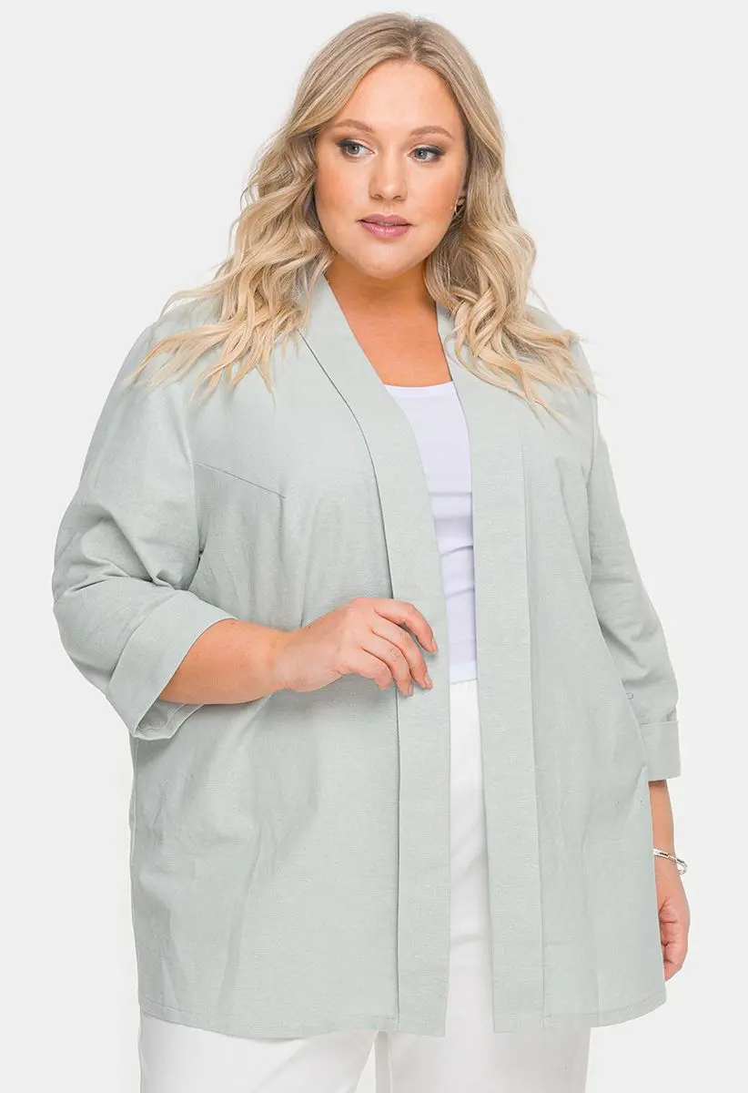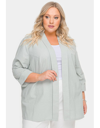 Жакет прямого силуэта из смесовой ткани, содержащей в составе лен и вискозу.. По бортам и низу рукавов притачные отвороты.