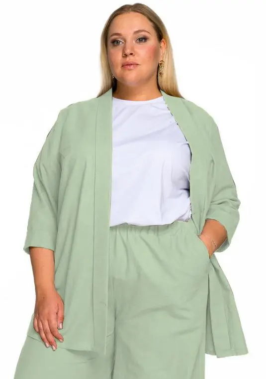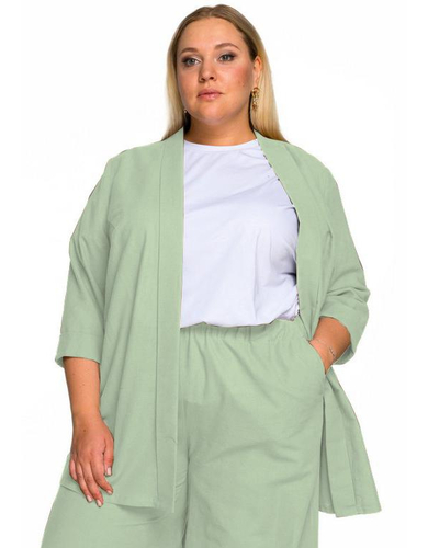 Жакет прямого силуэта из смесовой ткани, содержащей в составе лен и вискозу.. По бортам и низу рукавов притачные отвороты.