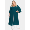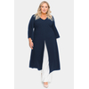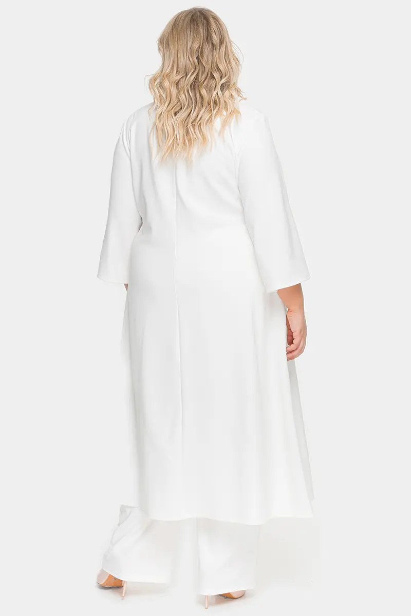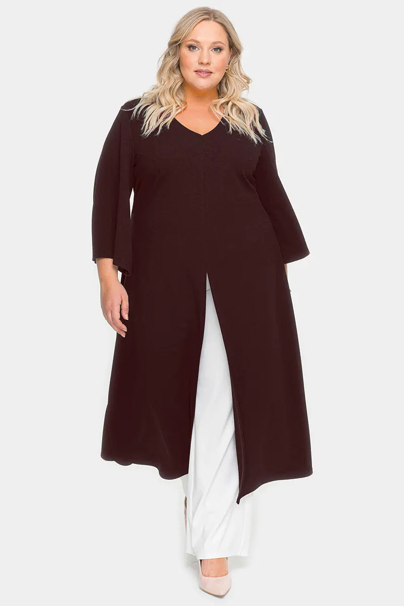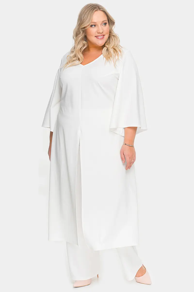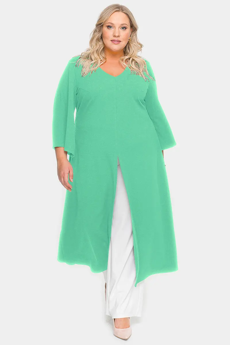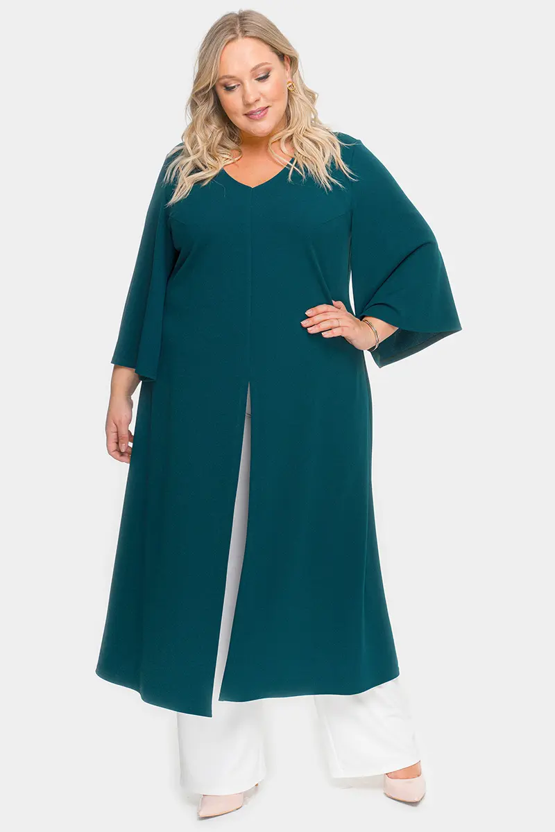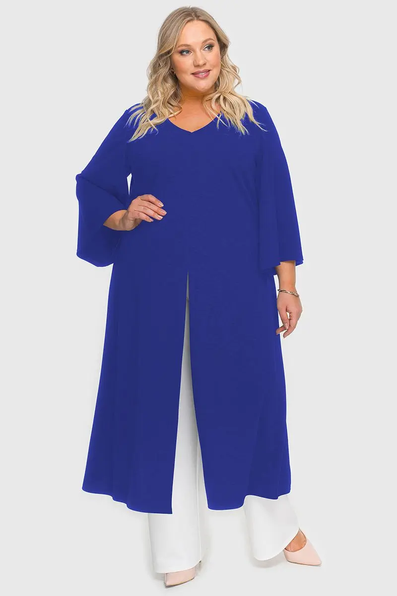 Удлиненная туника А-силуэта из крепа с эластаном. V-вырез горловины переда. По центральному шву переда разрез. Рукав расклешенный. Ткань – креп с эластаном, состав: 65% вискоза, 25% полиэстер, 10% эластан.. длина изделия по спинке от 127 см длина рукава 50 см.