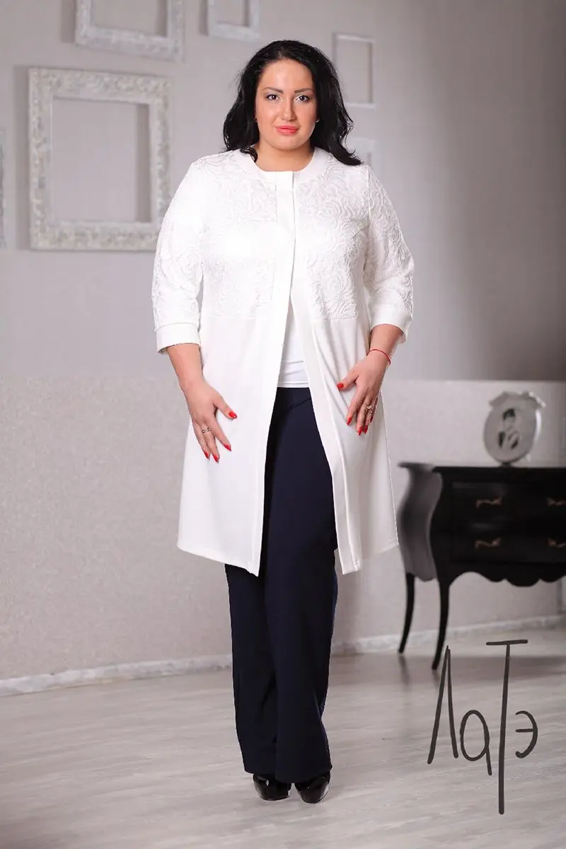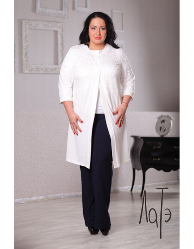 Шикарный кардиган прямого силуэта станет отличным дополнением любого образа. Верхняя часть из кружева и эластичного крепа. Застегивается на две пришивные кнопки в верхней части планки.