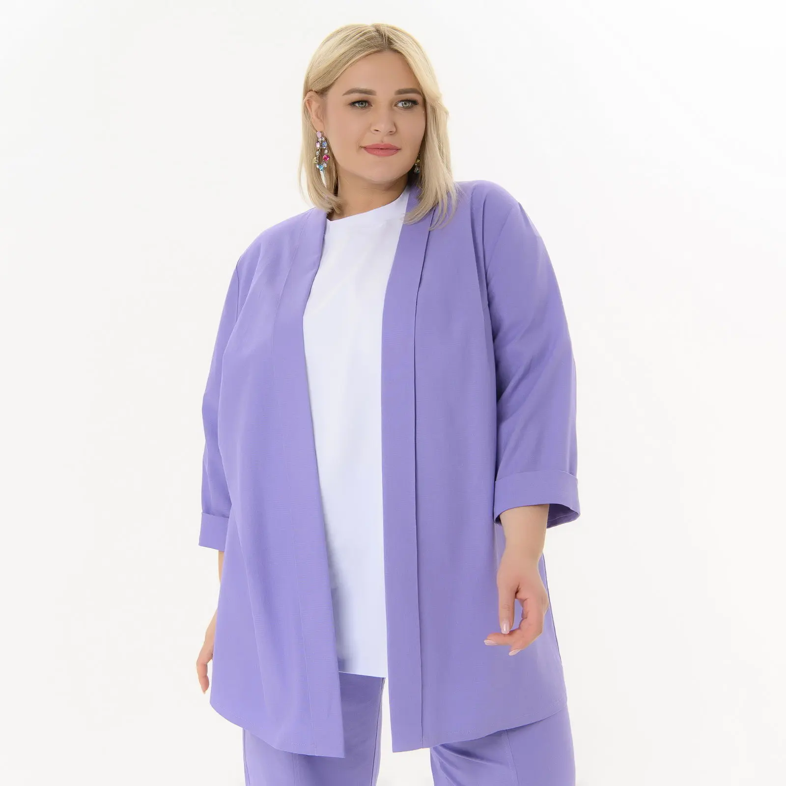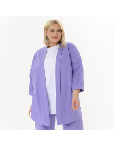Жакет прямого силуэта из смесовой ткани, содержащей в составе лен и вискозу. По бортам и низу рукавов притачные отвороты.