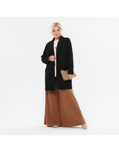 Кардиган - "летнее" пальто выполнен из плотного трикотажного джерси. Модель свободная, прямого силуэта. Воротник "шаль". Рукав длинный. По низу боковых швов закругления. Кардиган без подкладки. Ткань джерси-ангора, состав: 67% полиэстер, 30% вискоза, 3% эластан. Цвет - черный Длина изделия от 90 см по центру спинки. На модели представлен 56 размер. Параметры модели: - рост 175 см - обхват груди 110 см - обхват бедер 112 см.