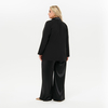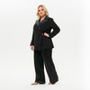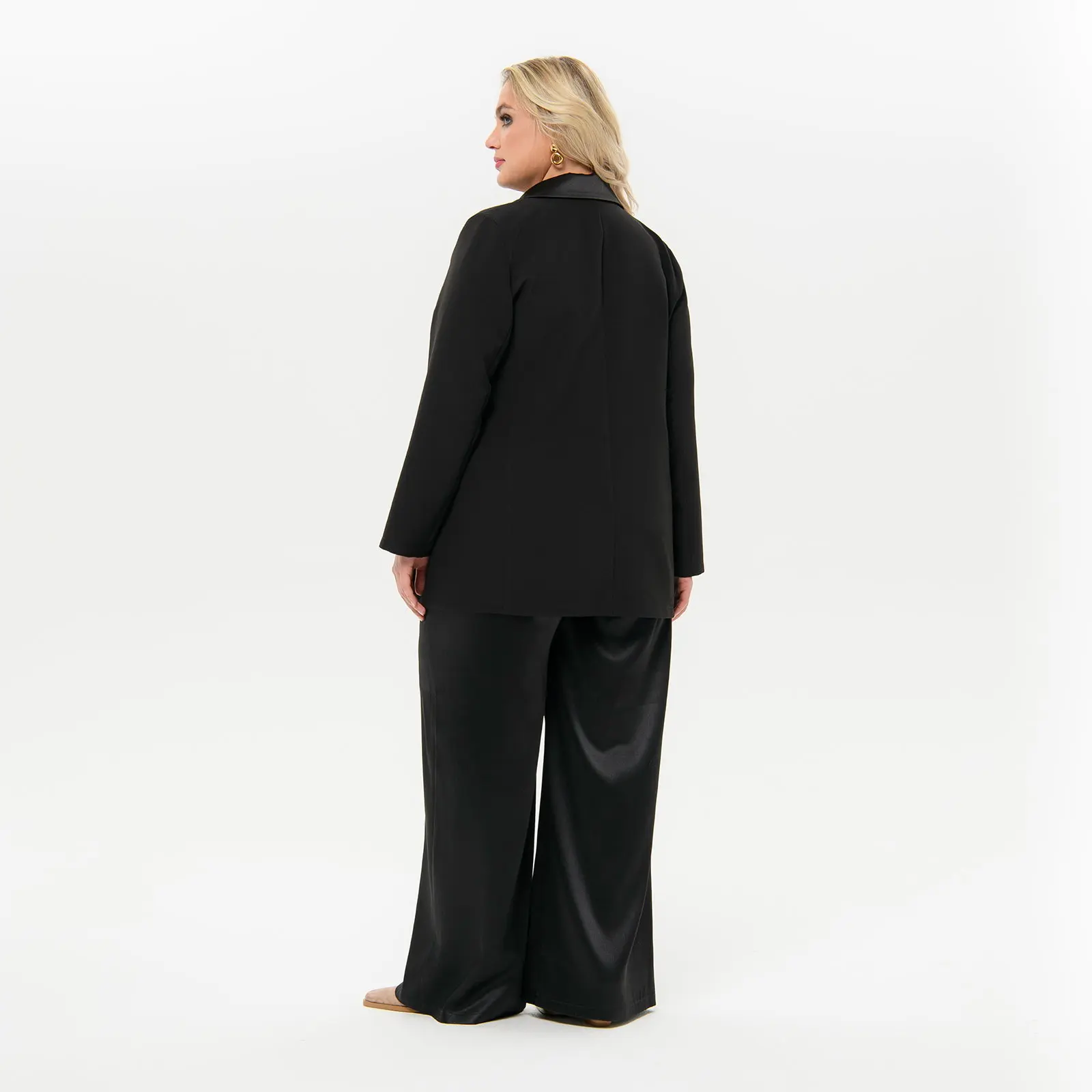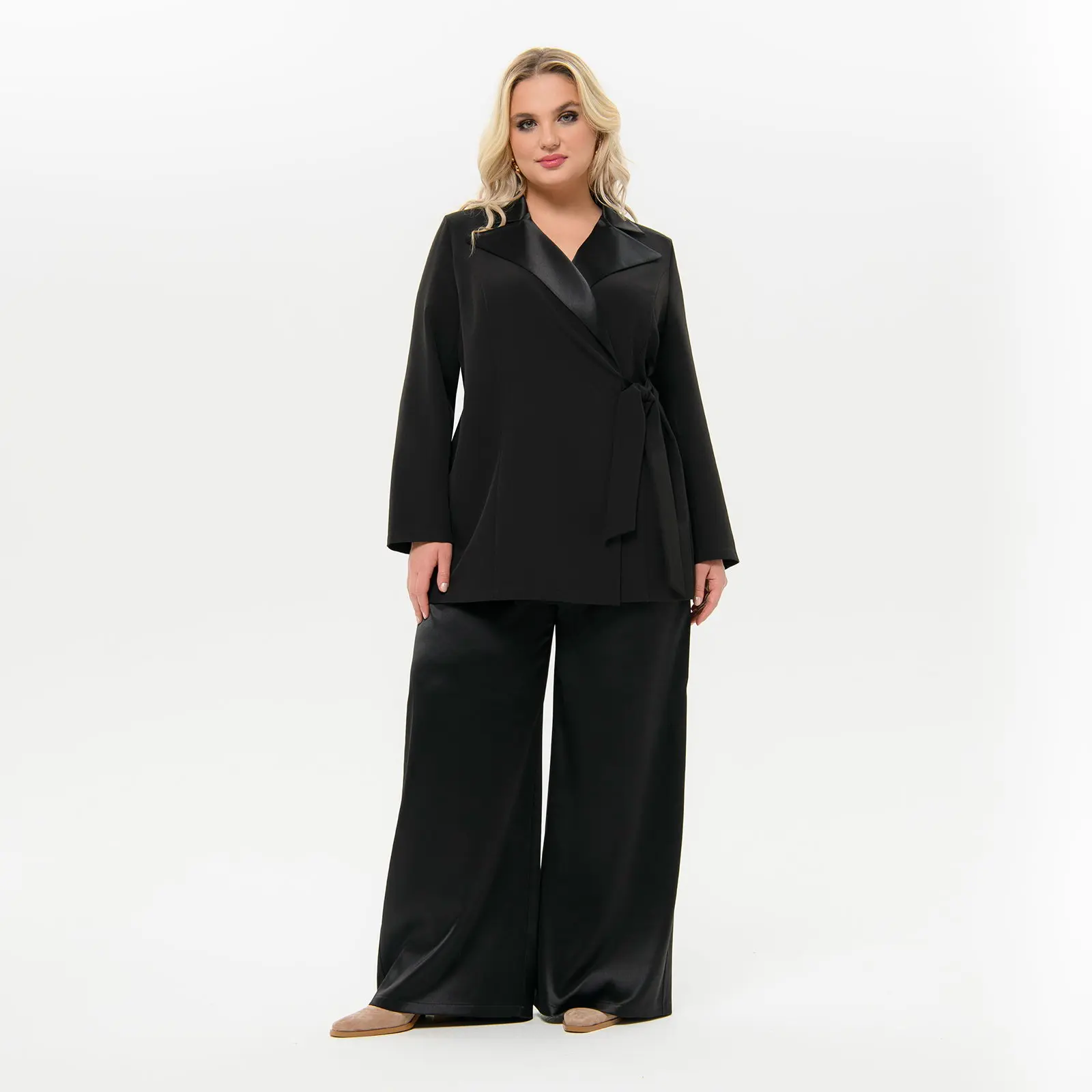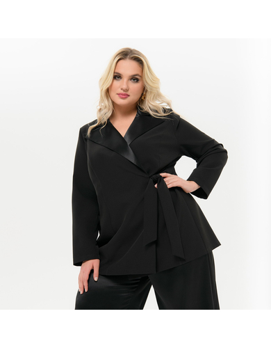 Элегантный жакет из костюмной ткани. Модель прямого силуэта с воротником пиджачного типа и длинными рукавами. Лацканы и воротник выполнены из отделочного атласа. Жакет завязывается на пояс, одна часть которого втачана в правый борт, вторая в левый боковой шов. Внутренний борт фиксируется завязочками по принципу платья с запАхом. Жакет без подкладки. Ткань костюмная; состав: 97% полиэстер, 3% эластан. Цвет - черный. Длина изделия от 77 см по центру спинки. Рост модели 172 см.