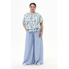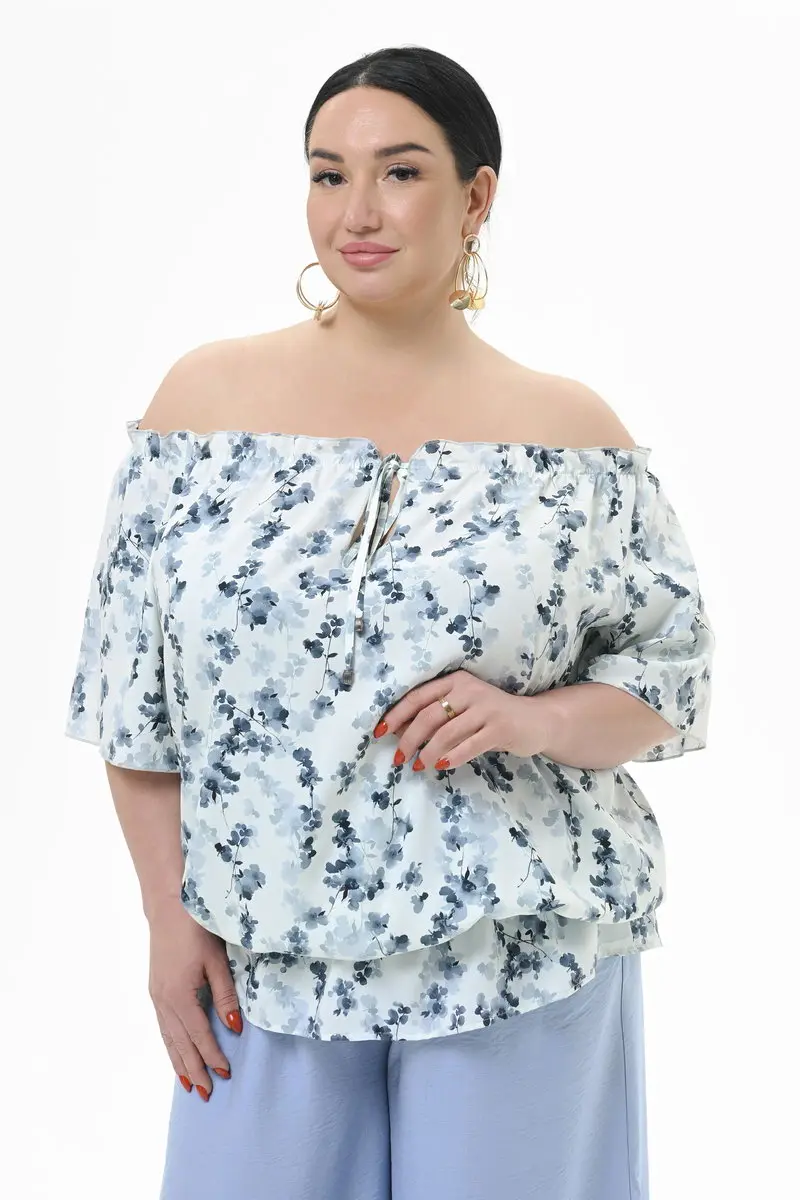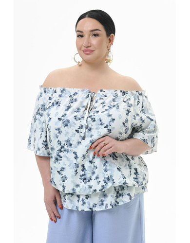 Туника из принтованного штапеля свободного силуэта. Рукав на основе реглан. Линия горловины расширена, на резиночке, за счет чего можно приоткрыть плечи. На уровне линии талии напуск, зафиксированный резинкой и позволяющий скрыть животик.