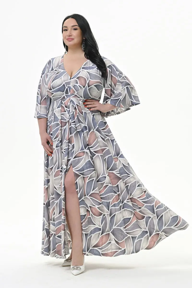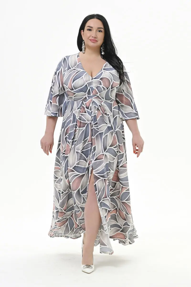 Платье длинное, с разрезом спереди, принт "серо-коралловый"