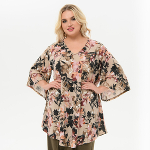 Туника свободная из джерси - ангора бежевая, принт цветочный