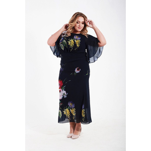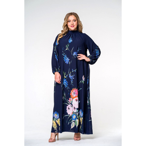 Туника свободная, шифон темно-синий, принт "синие цветы"