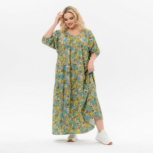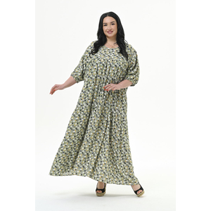 Платье из штапеля с воланом по горловине, принт "оливковые листья"