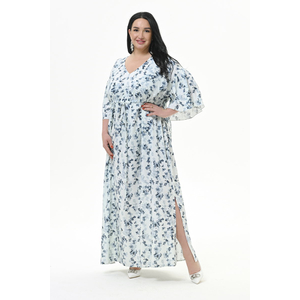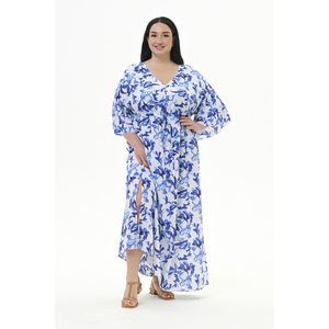 Платье длинное с V - вырезом, с кулисой под линией груди, штапель, принт "синяя роспись"