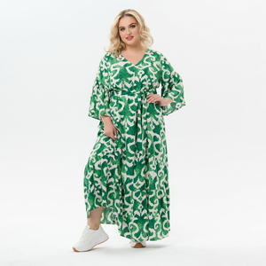 Платье длинное с V - вырезом и воланом по низу, штапель принт "зеленая абстракция"